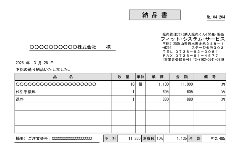 | 販売事業者 | フィット・システム・サービス https://www.fitss.com/ インボイス事業者登録:登録済み 代金引換をご利用の際の納品書のサンプル ![]() |